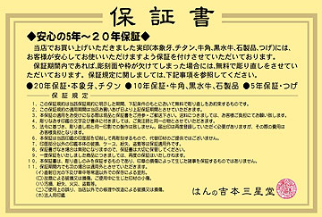 当店でお買い上げいただきました実印(本象牙、チタン、牛角、黒水牛、石製品、つげ)には、お客様が安心してお使いいただけますよう保証を付けさせていただいております。